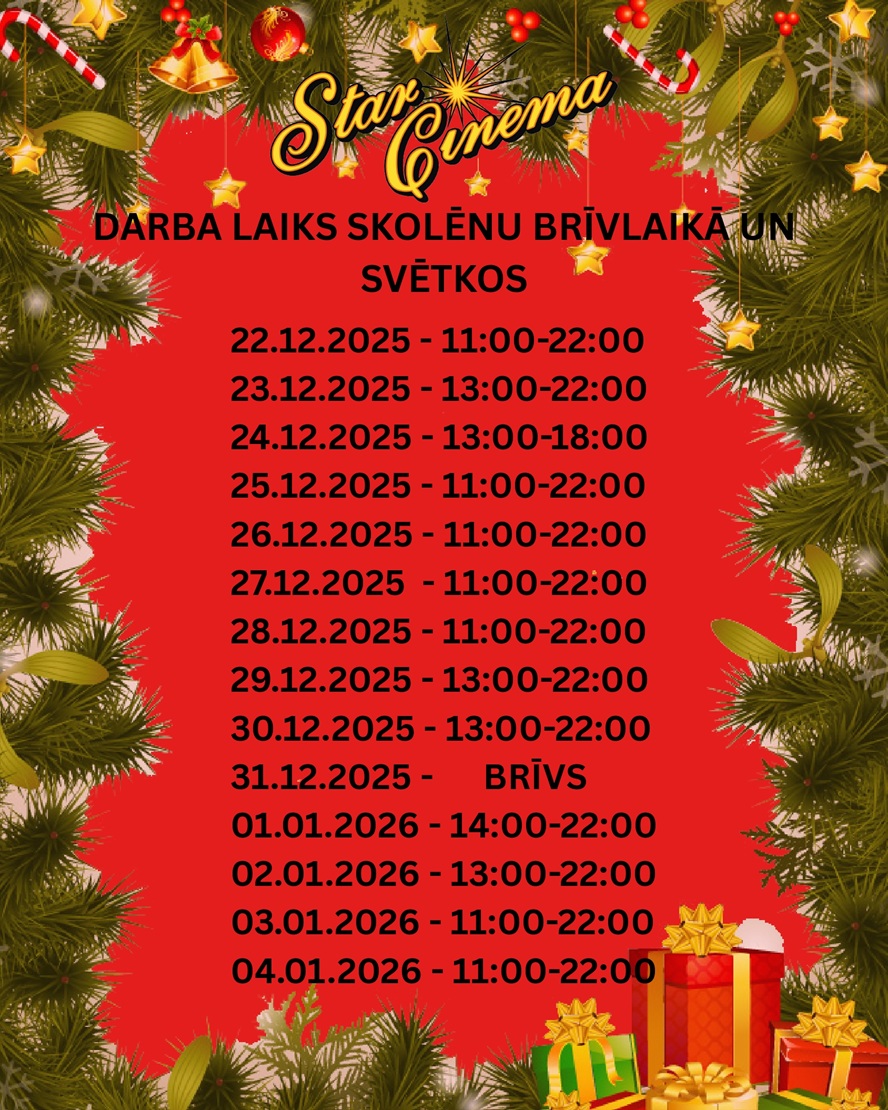 Izmaiņas kinoteātra Star Cinema Jūrmala darba laikos Ziemassvētku brīvdienās un jaunajā gadā.