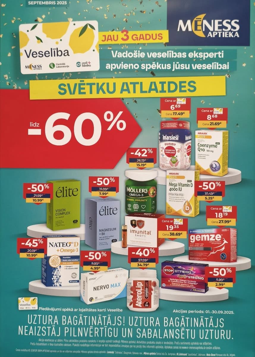 Rudens ir laiks, kad jāsāk pievērst uzmanību sava organisma aizsargspēju stiprināšanai. Tāpēc Mēness aptieka šobrīd ir īpaši patīkama atlaides vitamīniem un uztura bagātinātājiem.